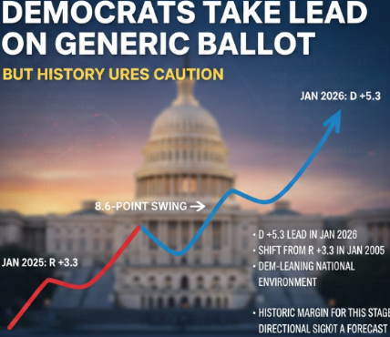 A year out from the 2026 midterms, the generic congressional ballot has swung to a significant Democratic lead,...