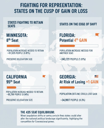 The stakes tighten even further. Wisconsin holds the 434th seat with a buffer of just 3,690 people, a microscopic 0.06%. Michigan controls the final 435th and last available seat in the model, protected by a margin of only 4,149 residents, 0.04%. These are not population swings in the millions. They are movements measured in neighborhoods, in apartment complexes, in a few thousand families deciding where to live.