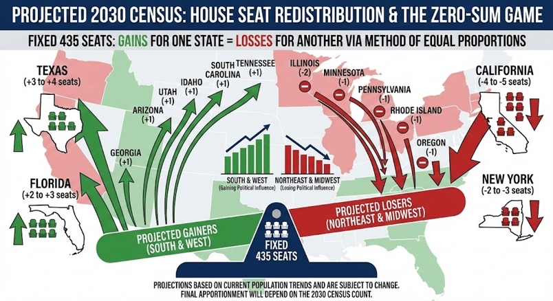 At the same time, every House seat shift alters the Electoral College. If Texas gains 4 seats and Florida 3, their path to influence expands. If California loses 4 and New York 3, their leverage contracts. The race to 270 will adjust accordingly.