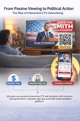 An even more advanced and underused opportunity lies in interactive CTV advertising. For decades, television ads have been a one-way street: the campaign speaks, and the voter passively listens. Interactive formats change that dynamic entirely. These are ads that feature elements like on-screen QR codes that a viewer can scan with their phone, or overlays that allow them to click for more information using their remote. This technology transforms the ad from a passive message into a direct call to action.