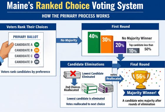 Maine’s ranked choice voting system complicates primary calculations for both campaigns. Instead of selecting a single candidate, voters rank preferences across multiple contenders. If no candidate secures an outright majority in initial results, lowest-performing candidates are eliminated and ballots are redistributed according to second choices.