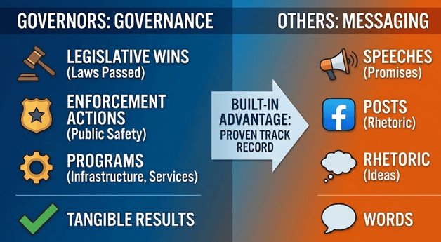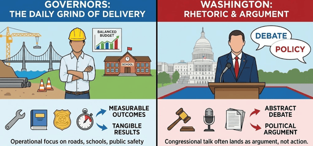 Here is where the strategy gets operational. “Run against Washington” is easy rhetoric, but hard positioning for Democrats if voters believe Democrats are part of Washington’s culture. Governors want to solve that problem by emphasizing the daily grind of governance. A governor can talk about roads, schools, disasters, budgets, and public safety as real things with measurable outcomes. Congress can talk about those things too, but it usually lands as argument instead of delivery.