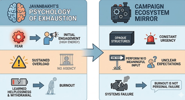 As Arash Javanbakht’s analysis of political exhaustion shows, fear initially drives engagement, but sustained overload without agency leads to learned helplessness and withdrawal. In campaign ecosystems, this mirrors what happens when coalition partners operate inside opaque structures, absorb constant urgency, and are asked to perform without meaningful input. When expectations are unclear and control is centralized, burnout is not a personal failure. It is a systems failure.