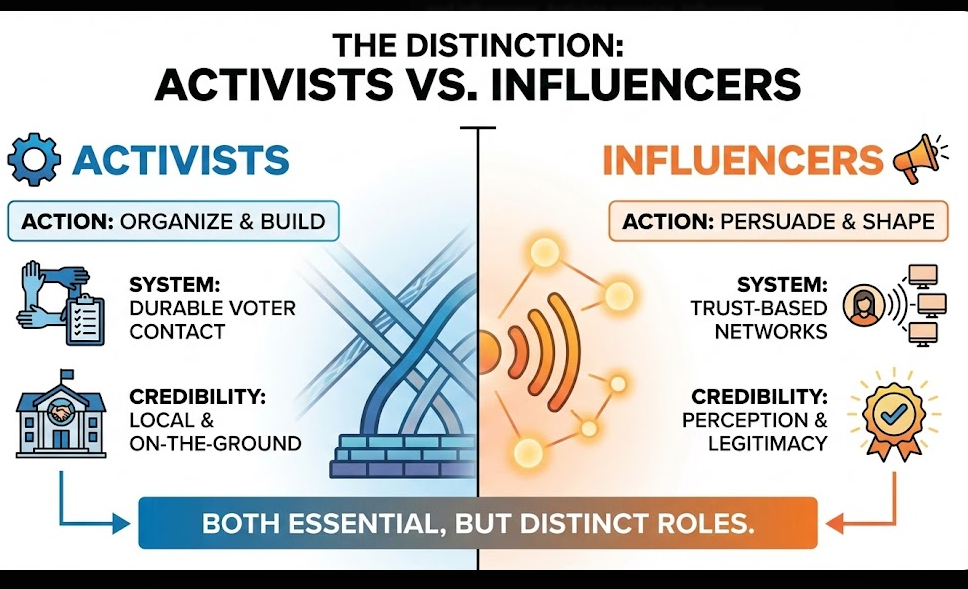 One of the most important distinctions raised in the AAPC conversation was the difference between activists and influencers. Activists organize. Influencers persuade. Activists build durable voter contact systems and local credibility. Influencers operate through trust based networks that shape perception and legitimacy.