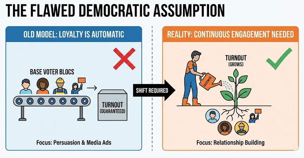 For much of the modern era, Democratic campaigns have operated under a durable but increasingly flawed assumption: that key voting blocs would remain loyal regardless of how they were engaged. Young voters, voters of color, labor households, and progressive activists were treated as reliable components of the electoral coalition rather than constituencies requiring continuous investment.