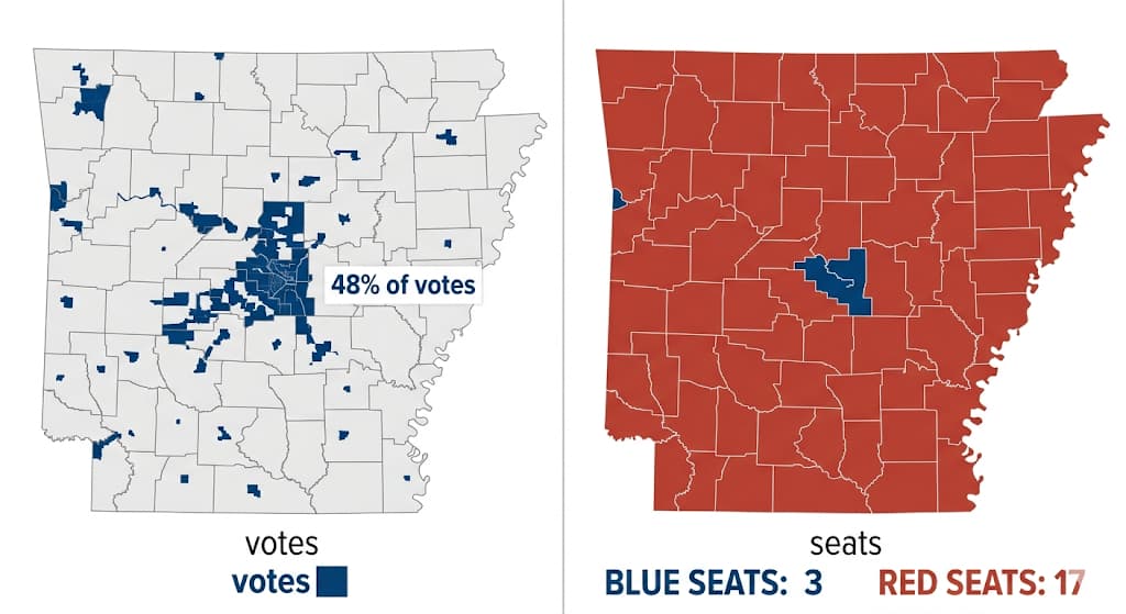 The structural problem for Democrats runs deeper than redistricting. It is baked into American geography. The way Democratic voters are distributed across the country means their votes pile up in districts already won by enormous margins, while Republican voters are spread more efficiently across a larger number of winnable seats. The result is a persistent gap between how many votes Democrats cast nationally and how many seats those votes actually produce.