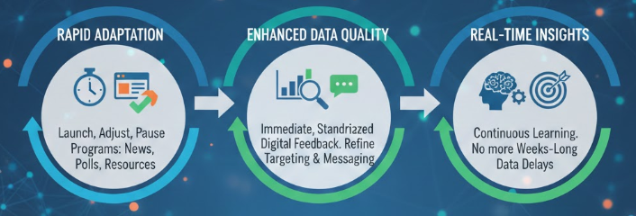 The gains from digital-first field operations are significant. Scale is the most immediate advantage. Digital outreach allows campaigns to reach voters that traditional canvassing often cannot, including rural communities, gated developments, and highly mobile populations. Speed follows closely.