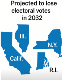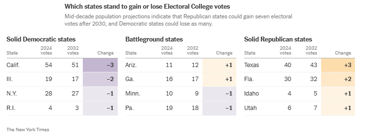 - California, New York, and several swing states are expected to lose electoral votes after 2030.