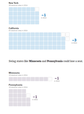 On the losing end are the Democratic power centers of California and New York, which together could forfeit four votes. Swing states such as Pennsylvania and Minnesota are each expected to drop one. The net effect is unmistakable.