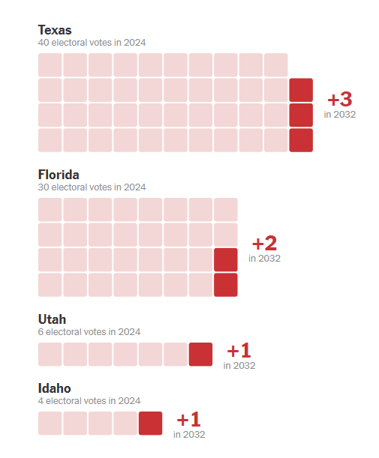 The political map of the 2030s is already taking shape as Americans move south and west. According to a New York Times analysis of new census projections, population growth in red states like Texas and Florida is quietly rewriting the rules of presidential politics. Both states are projected to gain a combined five electoral votes after the 2030 census, while Utah and Idaho will each add one.