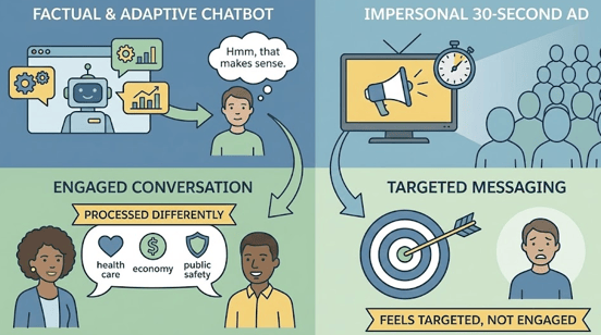 Researchers found that chatbots were most persuasive when they used facts and evidence and adapted their responses to individual users. This matters for campaigns because it suggests persuasion works best when voters feel engaged rather than targeted. A conversation that responds to concerns about health care, the economy, or public safety is processed differently than a thirty second ad.