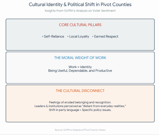 Culturally, pivot county voters place high value on self-reliance, local loyalty, and earned respect. Work is central to identity. Being useful, dependable, and productive carries moral weight. The analysis shows that Democrats lost the most ground among older, non-college white voters whose sense of belonging and recognition eroded as party language and priorities shifted. This was less about specific policies and more about feeling culturally misaligned with institutions and leaders perceived as distant from everyday realities.