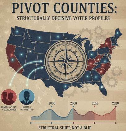 The story of pivot counties is no longer about political volatility or momentary swings between parties. At Campaign Now, we define pivot counties as places where a specific voter profile has become structurally decisive over time. These counties did not simply drift away from Democrats in a single election.