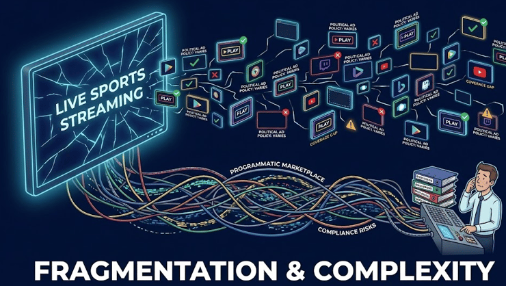 The downside is fragmentation. Streaming rights are scattered across platforms with uneven political ad policies, creating coverage gaps at precisely the moments campaigns want maximum saturation. Buying live sports inventory on CTV also introduces complexity across platforms, apps, and programmatic marketplaces, with compliance and disclosure risks layered on top.