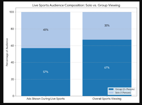 Campaigns routinely evaluate ads using impressions and household reach. Sports breaks that model because the audience is often not alone. Comcast Advertising reports that 57% of ads shown during live sports are seen by groups of two or more. Separate Comcast analysis also notes that 67% of sports viewing involves two or more people at a time.