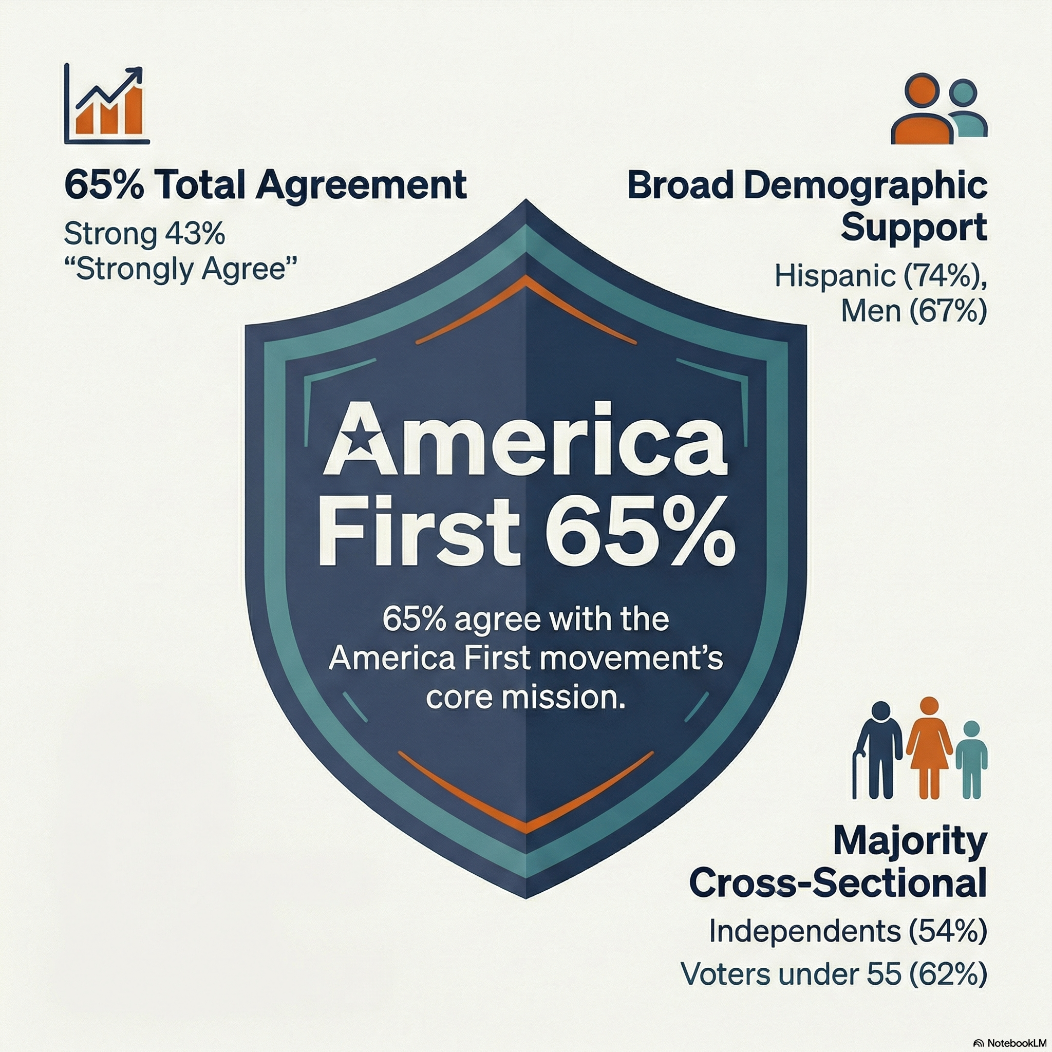 Beyond cost-of-living concerns, the poll also captures a broader appetite for ‘America First’ policy framing. In fact, 65% agree with the America First movement’s core mission—an indicator that a values-and-priorities message may resonate alongside economic relief.
