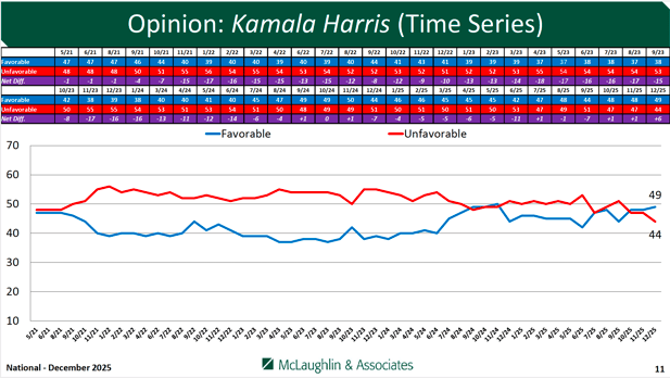 - Harris is now 49% favorable / 44% unfavorable, up from 48% / 47% in November.