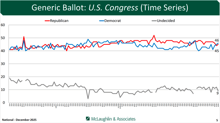 The clearest shift in the McLaughlin December Poll is the generic congressional ballot. After trailing 44% to 46% in November, Democrats lead 46% to 45% in December. That’s not a durable advantage; it’s a sign of a competitive national environment where small changes matter.