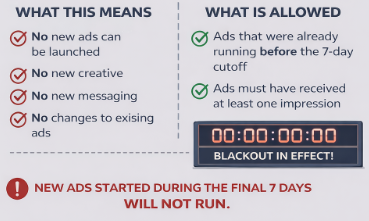 Any ad that has received at least one impression before the cutoff may continue running. But nothing new can be uploaded. No fresh creative. No new attack lines. No rapid-response pivot. No emergency counterstrike. Once the clock hits seven days out, the digital battlefield hardens.