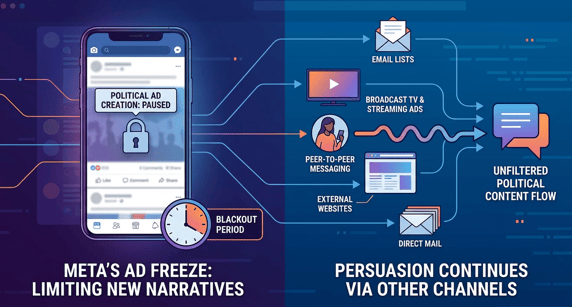 By freezing new political ad creation in the closing stretch, Meta attempts to reduce that speed advantage. The goal is not to silence campaigns, but to limit the introduction of fresh paid narratives when time for scrutiny is shortest. Whether that approach fully succeeds remains debated. Political content continues to flow through organic posts, external websites, peer-to-peer messaging, email lists, streaming ads, broadcast television, and direct mail.
