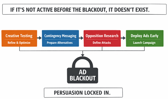 For digital directors, the mandate is blunt. If the message is not active before the blackout begins, it does not exist in the most saturated political advertising ecosystem in the country. That forces campaigns to front-load creative testing, contingency messaging, and opposition frameworks well before the final week. The blackout does not eliminate persuasion. It locks it in.