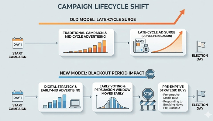 For years, campaigns relied on late-cycle ad surges to define opponents or respond to breaking news. Industry reporting from Campaigns & Elections consistently shows that final-week spending has been used to drive persuasion when undecided voters are most engaged. The blackout compresses that window and moves the decisive phase earlier.