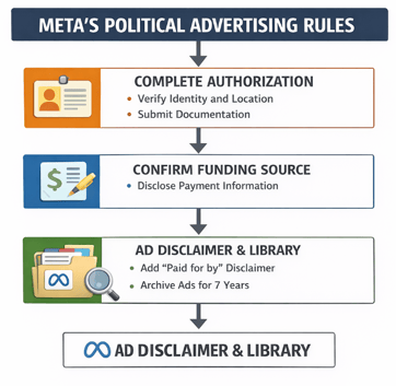 The final week ban operates within a broader framework of political advertising rules. Meta requires political advertisers to complete an authorization process that verifies identity and location. Advertisers must provide documentation and confirm who is paying for the advertisement. Every qualifying political ad must include a visible “Paid for by” disclaimer. These ads are then stored in Meta’s publicly searchable Ad Library, where they remain archived for seven years.