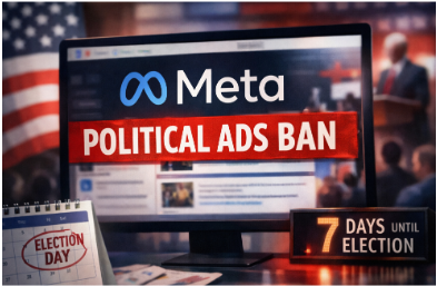 Meta has confirmed it will enforce its final week ban on new political advertising for the 2026 U.S. elections, continuing a policy first implemented during the 2020 cycle. The restriction applies to Facebook and Instagram and is designed to prevent campaigns or outside groups from launching last minute attack ads that cannot be meaningfully challenged before voters head to the polls.