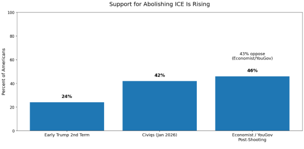 - A January 2026 poll shows 57% of voters disapprove of ICE’s methods, while support for abolishing the agency has risen to 42%.