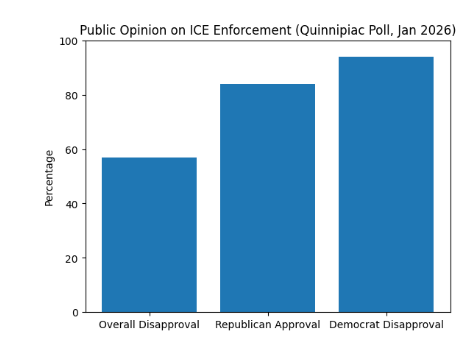 Recent polling data reveals a significant and growing public disapproval of ICE's methods. A Quinnipiac University poll conducted in January 2026 found that 57% of voters disapprove of the way ICE is enforcing immigration laws. The partisan divide on this issue is stark, with 84% of Republicans approving of ICE's actions, while 94% of Democrats disapprove.