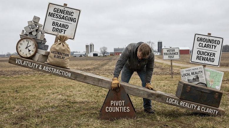 For down-ballot candidates, this matters immediately. When presidential margins harden in pivot counties, local races inherit that gravity whether they want it or not. Media buys become less efficient, persuasion becomes more expensive, and mistakes compound faster. Campaigns that assume they can outrun the top of the ticket without adapting their message often discover too late that voters are evaluating everything through the same trust lens.