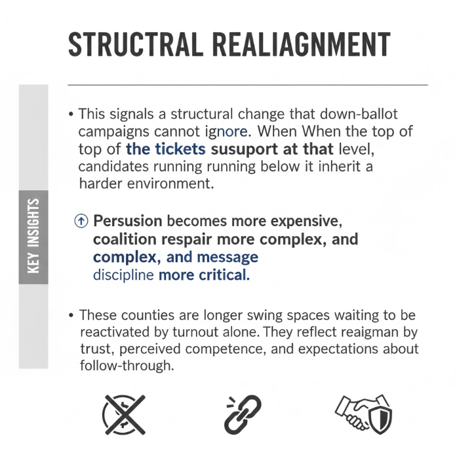 This signals a structural change that down-ballot campaigns cannot ignore. When the top of the ticket consolidates support at that level, candidates running below it inherit a harder environment. Persuasion becomes more expensive, coalition repair more complex, and message discipline more critical. These counties are no longer swing spaces waiting to be reactivated by turnout alone. They reflect a deeper realignment driven by trust, perceived competence, and expectations about follow-through.