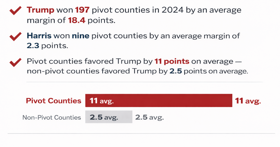 - In 2024, Trump won 197 pivot counties by an average 18.4 points, while Harris won nine by an average 2.3 points, reinforcing that most of this universe is now structurally Republican unless conditions change.