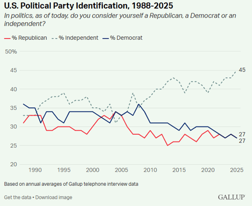 - A record-high 45% of U.S. adults identified as political independents in 2025, according to a recent Gallup poll.