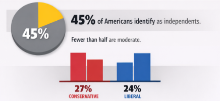 Elections are increasingly influenced by voters who reject party labels, but that does not mean they are moderates. A record 45% of Americans now identify as independents, according to Gallup. Yet fewer than half describe themselves as moderate. 27% identify as conservative or very conservative, and 24% identify as liberal or very liberal. As Kristen Soltis Anderson wrote in The New York Times: