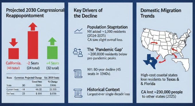 Census trend analyses reported by the New York Post project that New York and California will lose a combined six House seats after the 2030 census, roughly a 10% reduction in congressional representation for each state. New York is expected to lose two seats, California four, continuing a decades-long decline tied to population stagnation. Both states remain down roughly 200,000 residents since the pandemic, with New York adding just 1,000 residents between mid-2024 and mid-2025.