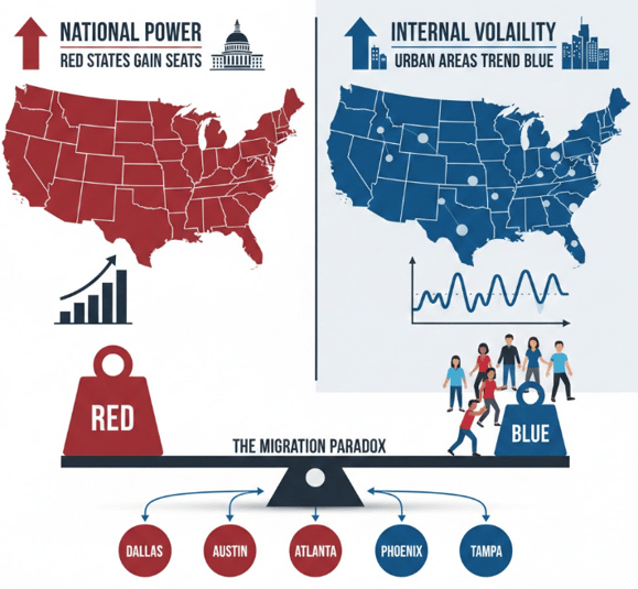 Crucially, many of the fastest-growing areas inside red states are urban and suburban corridors that have been trending more Democratic over time. Growth around Dallas, Austin, Atlanta, Phoenix, and Tampa is reshaping internal state politics even as those states gain seats nationally. The result is a paradox: red states gain power on paper, while their internal political balance becomes more volatile and less predictable.