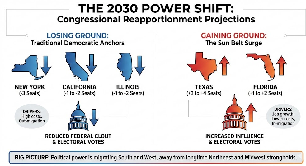 Across multiple independent analyses, the takeaway is increasingly hard to ignore. States that have anchored Democratic power for decades are losing population share, and with it, congressional clout. California, New York, and Illinois are all projected to lose House seats after the 2030 reapportionment. Reporting by Fox News highlights estimates showing those states shedding as many as six seats collectively, with some broader models pushing the combined loss even higher.