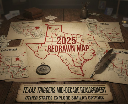 Texas’s 2025 move to redraw its map mid-decade marked the clearest modern trigger. Other states quickly signaled they were exploring similar options, including California, Missouri, and North Carolina.