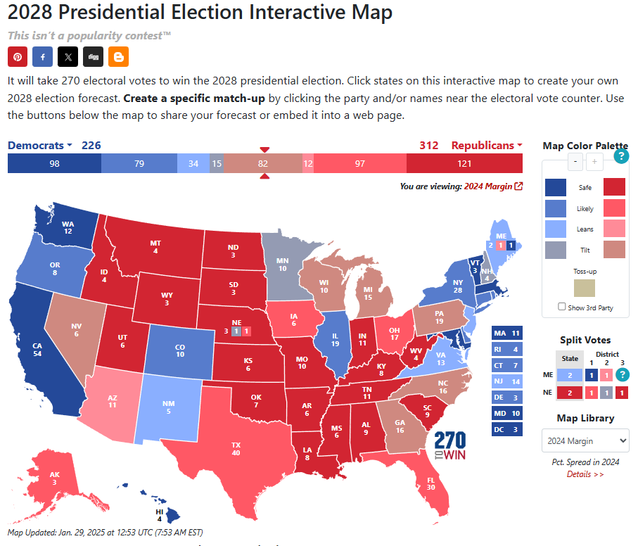 - It will still take 270 electoral votes to win the presidency in 2028, and early interactive maps are already influencing donor behavior, media narratives, and campaign strategy.