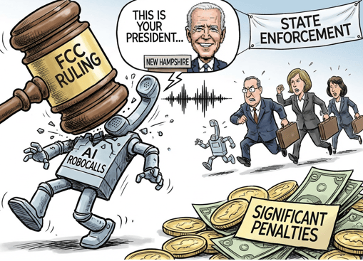 While the FEC remains gridlocked on AI campaign rules, the Federal Communications Commission has acted within its lane. In February 2024, the FCC ruled that AI-generated and voice-cloned audio qualifies as an “artificial or prerecorded voice” under the Telephone Consumer Protection Act, meaning robocalls and robotexts using synthetic voices require prior express consent and full TCPA compliance.
