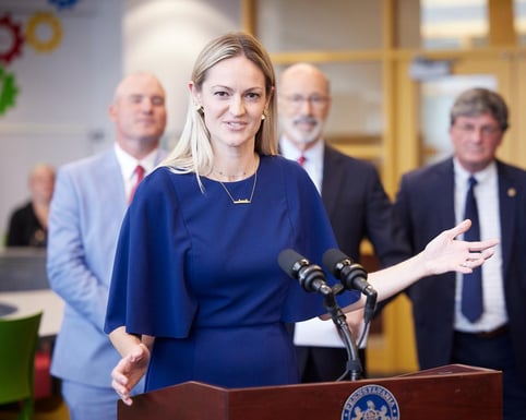 Paige Cognetti announces her congressional bid in Harrisburg. Photo via Spotlight PA/Commonwealth Media Services.