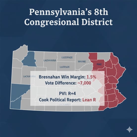 PA-08 is a telling test case for the post-Blue Wall era. Democrats are experimenting with a strategy that emphasizes local reform credentials, anti-corruption messaging, and “competence over ideology” framing. If that works in a district rated Lean R with an R+4 baseline, it becomes a model for other rural-adjacent seats where Democrats have slipped.