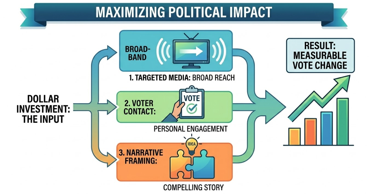 Elasticity is only valuable if it changes behavior. Most campaigns acknowledge the concept and then ignore it when making decisions. That is where opportunities are lost. Elasticity should dictate where money goes first, not last. In high-elasticity states, persuasion is worth the investment. These are the environments where targeted media, voter contact, and narrative framing can actually move margins in a meaningful way. Every dollar has the potential to produce amplified returns.