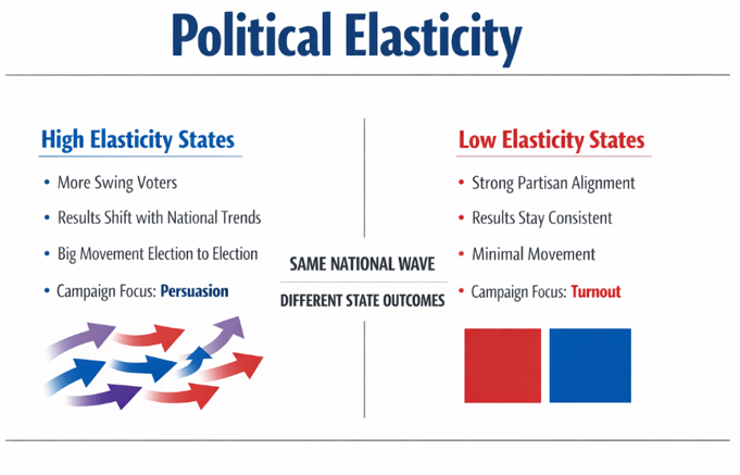 This dynamic is defined by political elasticity. High-elasticity states, typically with larger shares of swing voters, can amplify national trends and produce outsized movement. Low-elasticity states, where voters are firmly aligned along partisan lines, tend to resist those shifts. As a result, even a meaningful national swing may generate significant gains in some states and negligible change in others.