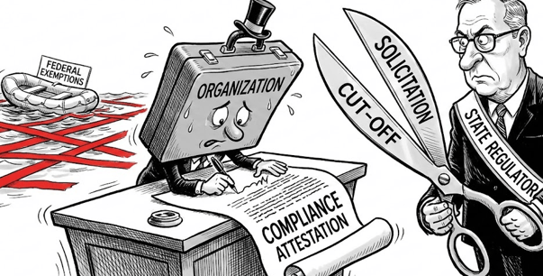 Organizations must attest to compliance in order to keep raising money in the state and can be cut off from solicitation if they violate the rules. Critically, these state laws do not always copy the exemptions that make federal FARA manageable for many commercial actors.