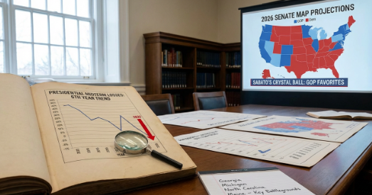 Historical "sixth-year itch" suggests a 2026 "blue wave," yet Sabato's Crystal Ball favors the GOP to keep Senate...