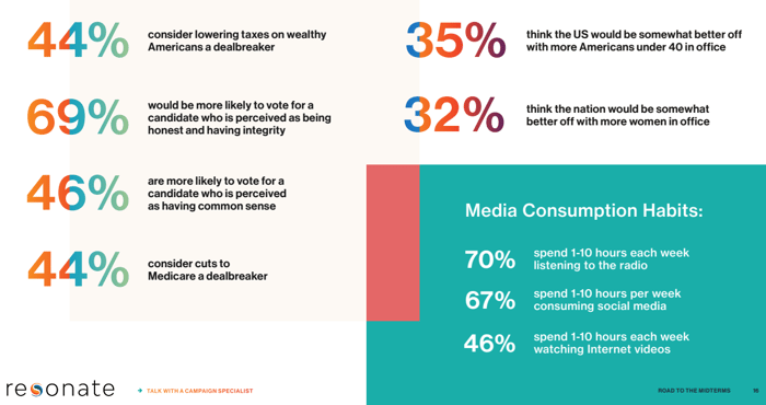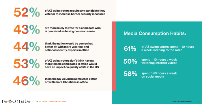 Radio, for example, remains a surprisingly powerful tool. A majority of swing voters in key states report listening for 1 to 10 hours per week, making local talk radio and news broadcasts a critical channel. This includes: