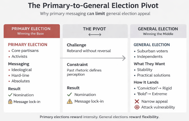 A candidate who ignores these complexities in favor of a rigid, base-focused message will struggle. What reads as conviction in a primary can look extreme in a general election.