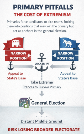 - Candidates who clear ideologically rigid primaries often face constraints in appealing to general-election moderates.